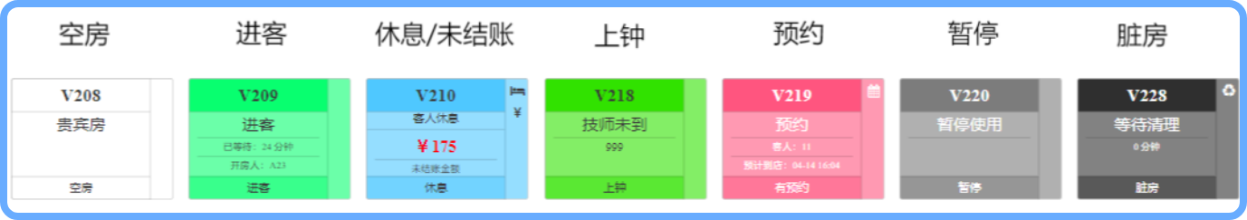 - 房间状态:无论是空房、进客、上钟、休息、计时、脏房、暂停、缺技师、未结账、有预约还是等服务、能反映出准确的房间状态,让您一目了然。不仅如此,我们还提供不同的视图样式,让您的房间状态个性化和显示与众不同。