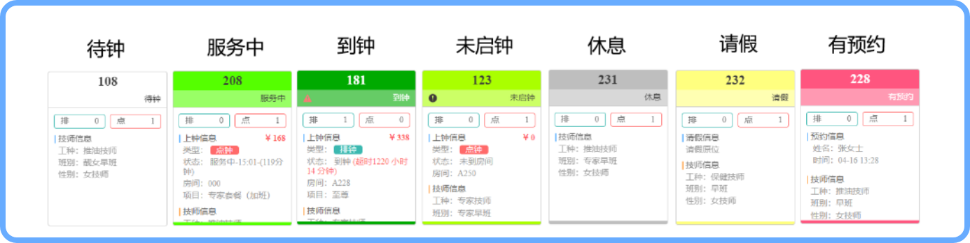 - 技师状态视图:为了更直观地显示技师的工作状态,您可以根据个人喜好设置技师状态对应的颜色。例如,您可以自定义忙碌状态为红色,空闲状态为绿色,休息状态为灰色等等。