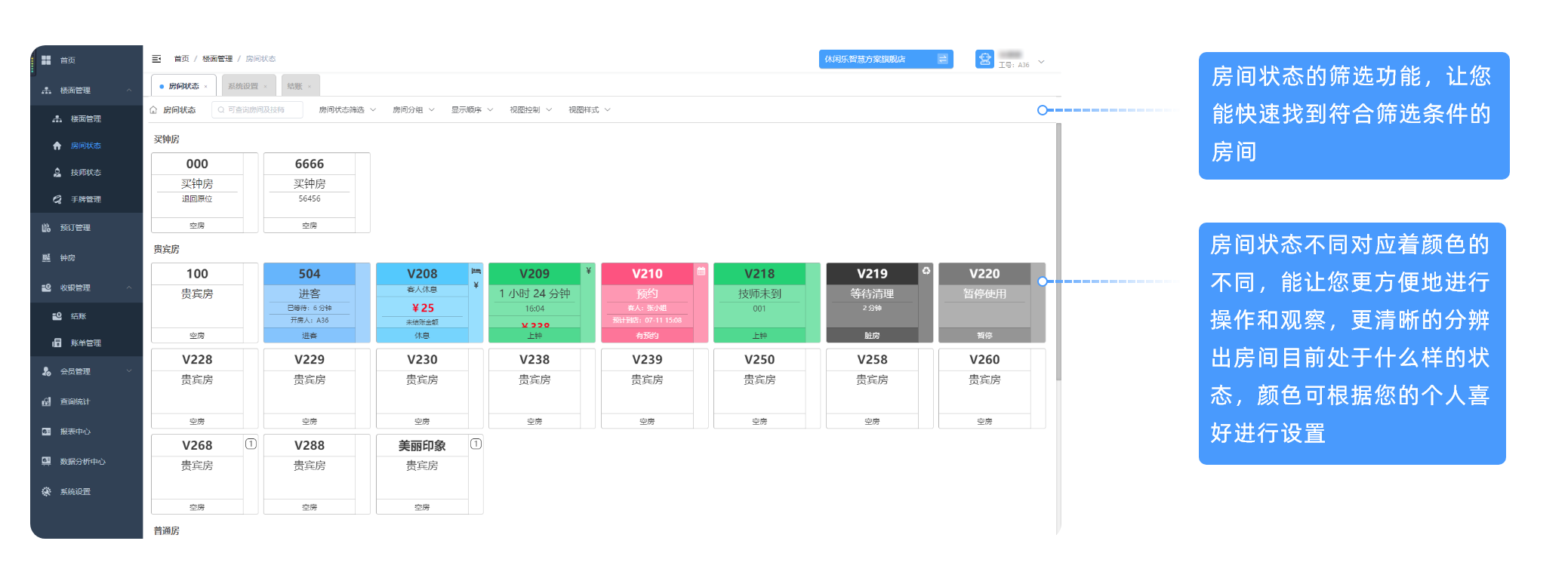 - 实时状态显示:房间状态能够准确展示当前所有房间的状态信息,让您时刻掌握每个房间的使用情况。
