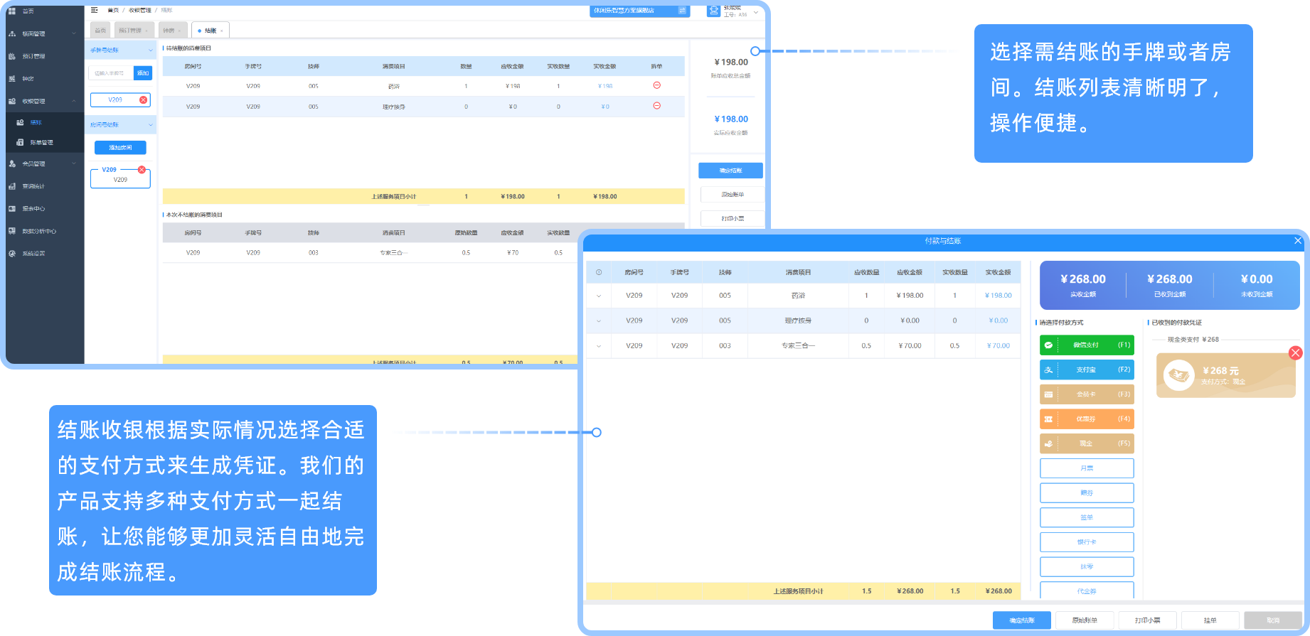 可以轻松选择需要结账的手牌或房间。您可以通过简单的操作将所有需要结账的项目都拉出,并呈现在一个直观清晰的列表中。这样,您可以方便地核对和确定待结账的账单。同时,如果您有不需要结账的项目,只需点击“拆单”按钮即可将其移动到“本次不结账的消费项目”中,使结账过程更加明确清晰。当您确认好账单后,只需点击“确定结账”按钮,系统将弹出“付款与结账”窗口。在这个窗口中,您可以根据实际情况选择合适的支付方式来生成凭证。我们的产品支持多种支付方式一起结账,让您能够更加灵活自由地完成结账流程。