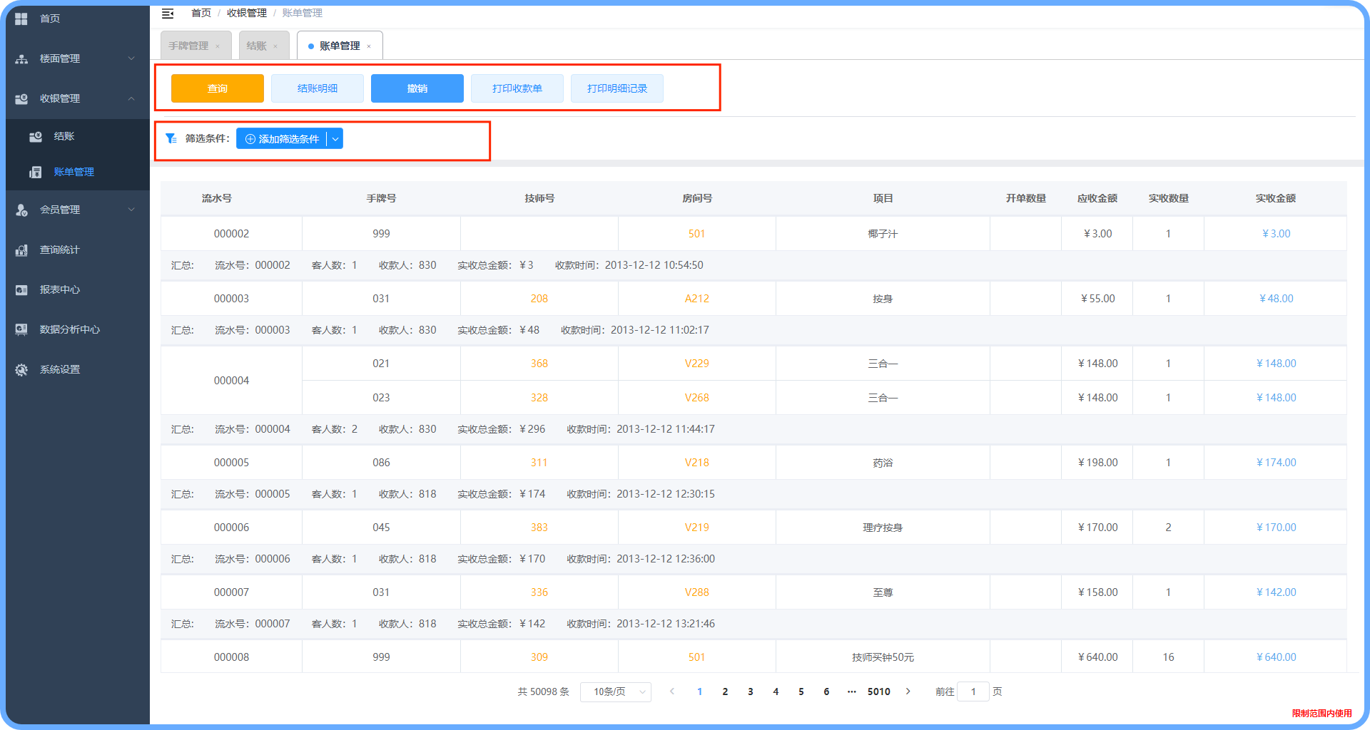 🔹 查询清单及收银结账单:原始开单记录、收银账单、操作日志
