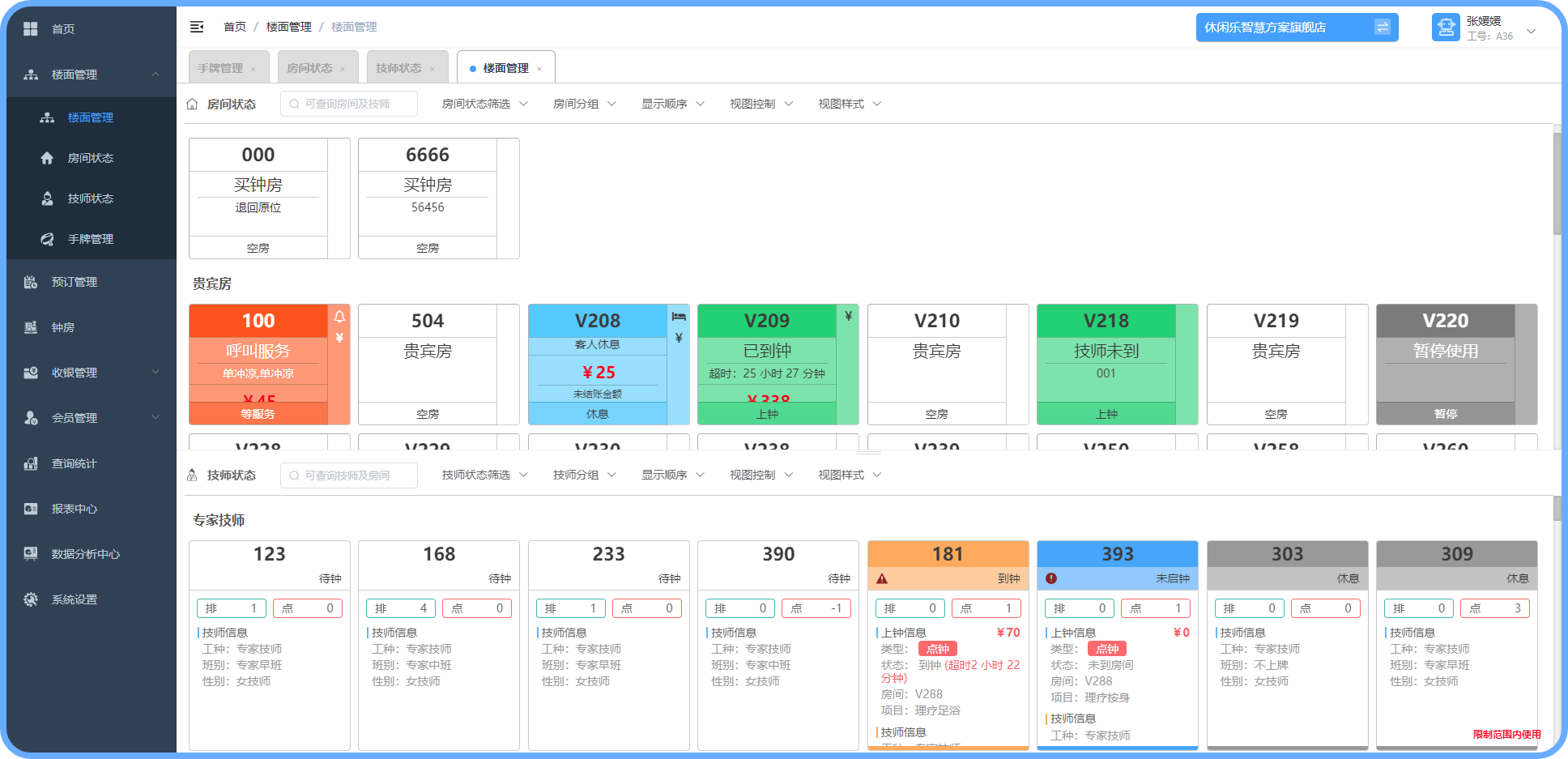 - 楼面管理是一个集合了房间状态和技师状态的合并版的功能。它提供了一种便捷的方式,让用户可以在各自区域内进行对房间和技师状态进行查询、通过状态筛选、分组、修改不同显示顺序、切换视图、改变视图大小等操作。该功能在帮助用户更好地管理楼面资源,提高工作效率和客户满意度。