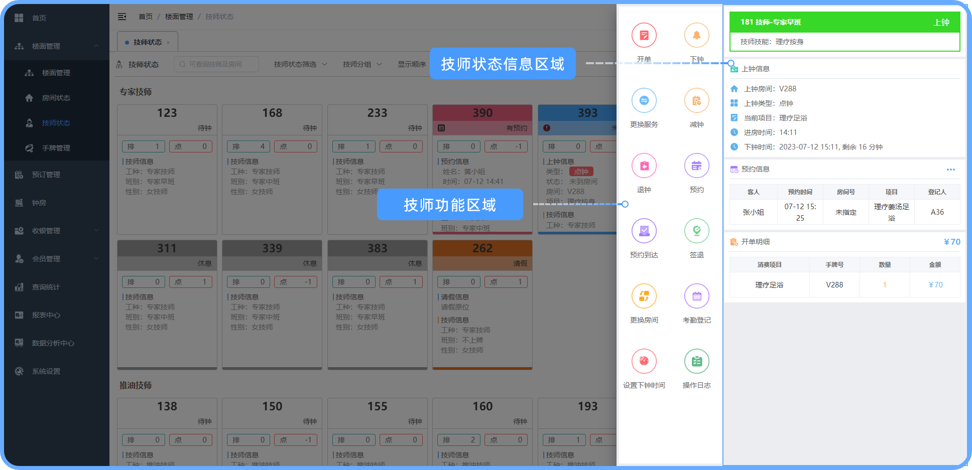 - 上钟信息:清晰显示技师的上钟情况,帮助您进行服务调度和工作安排。