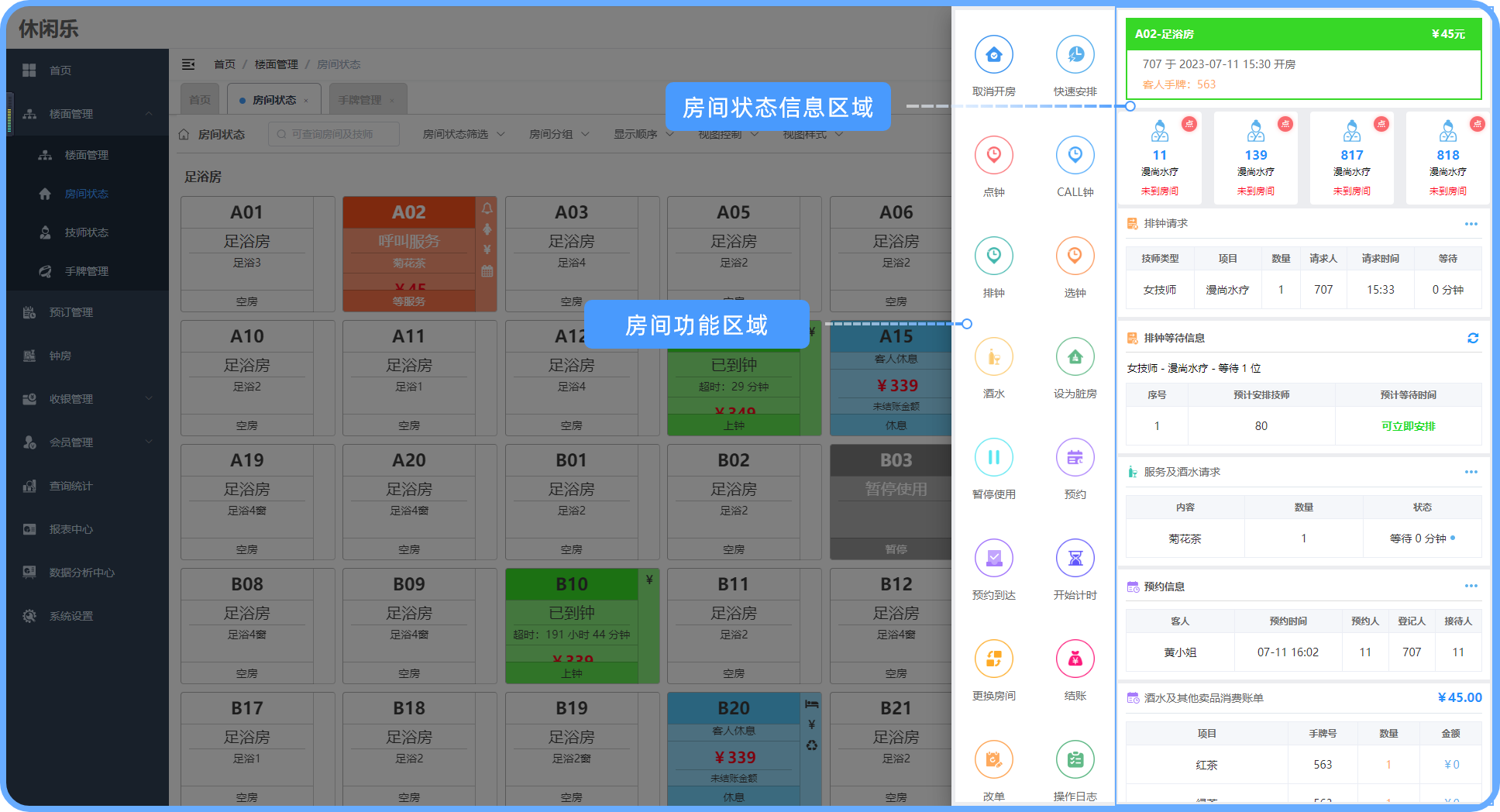 🔷 楼面管理功能包括房间管理和技师管理。您可以轻松管理不同房间的使用情况,确保客人有序且舒适地享受足浴服务。同时,技师管理功能能够帮助您对技师进行调度和安排,以提供优质的服务。