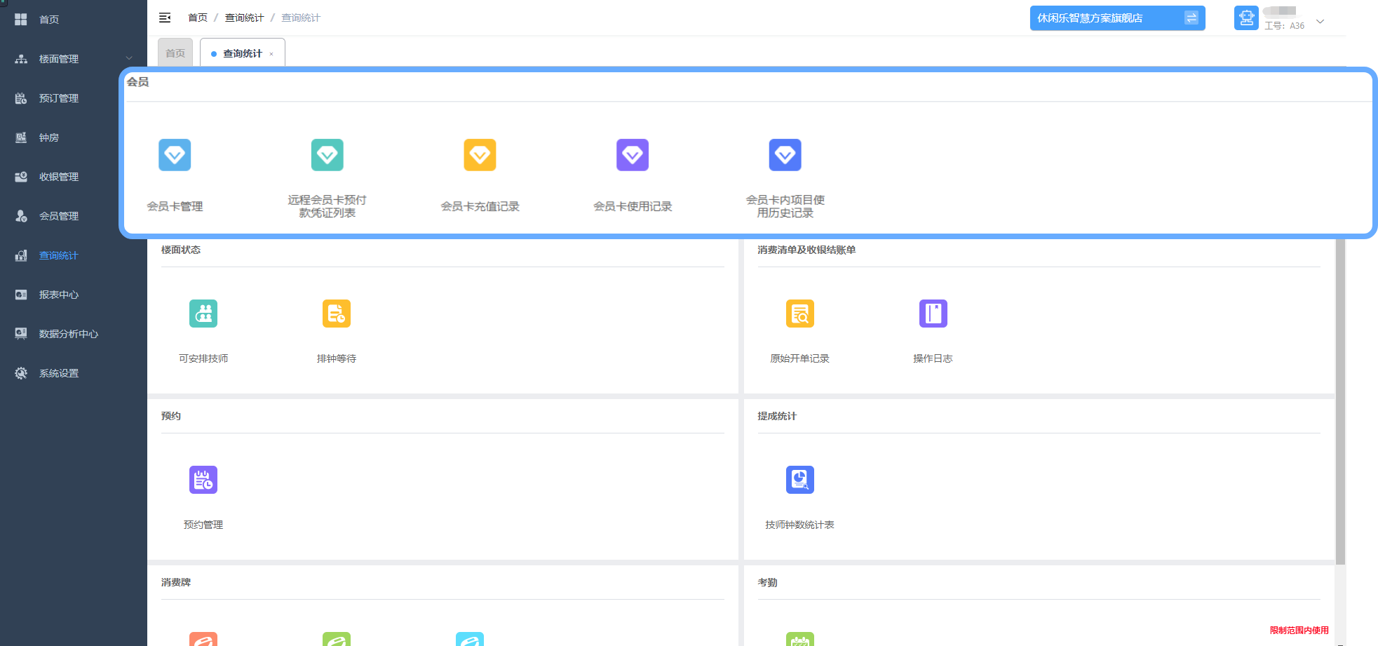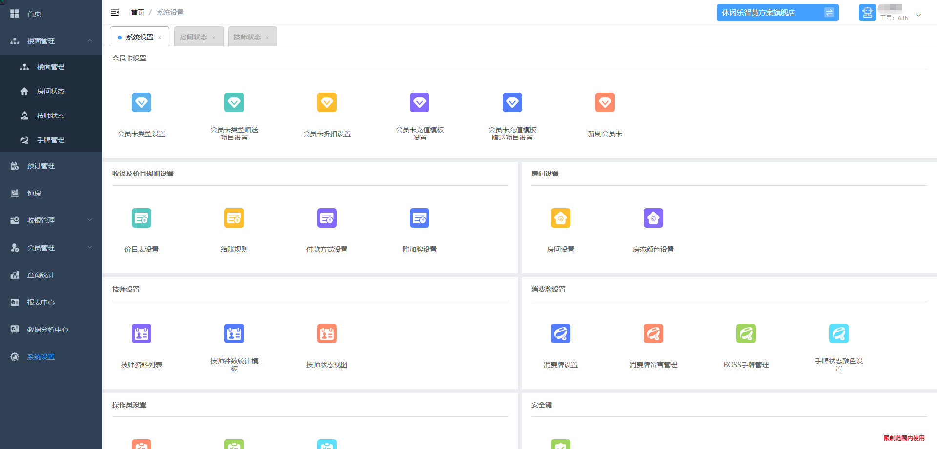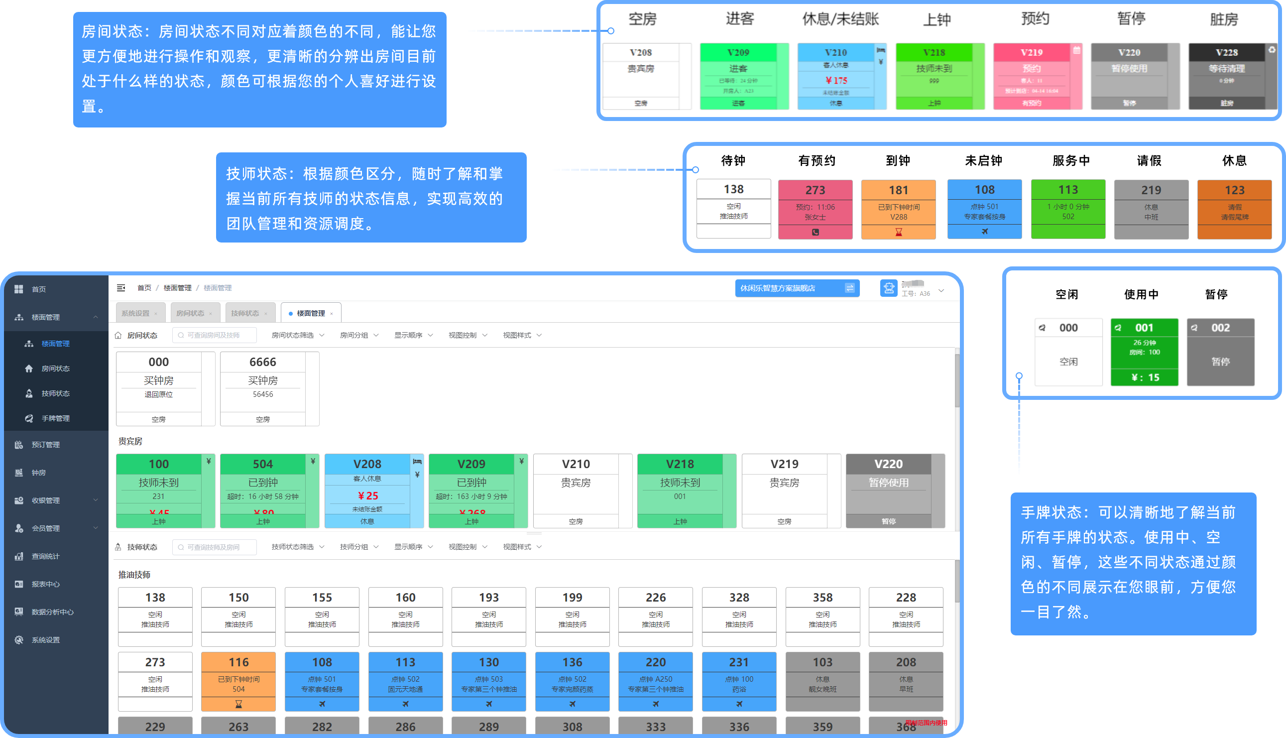 - 楼面管理:楼面管理是一个集合了房间状态和技师状态的合并版的功能。它提供了一种便捷的方式,让用户可以在各自区域内进行对房间和技师状态进行查询、通过状态筛选、分组、修改不同显示顺序、切换视图、改变视图大小等操作。该功能在帮助用户更好地管理楼面资源,提高工作效率和客户满意度。