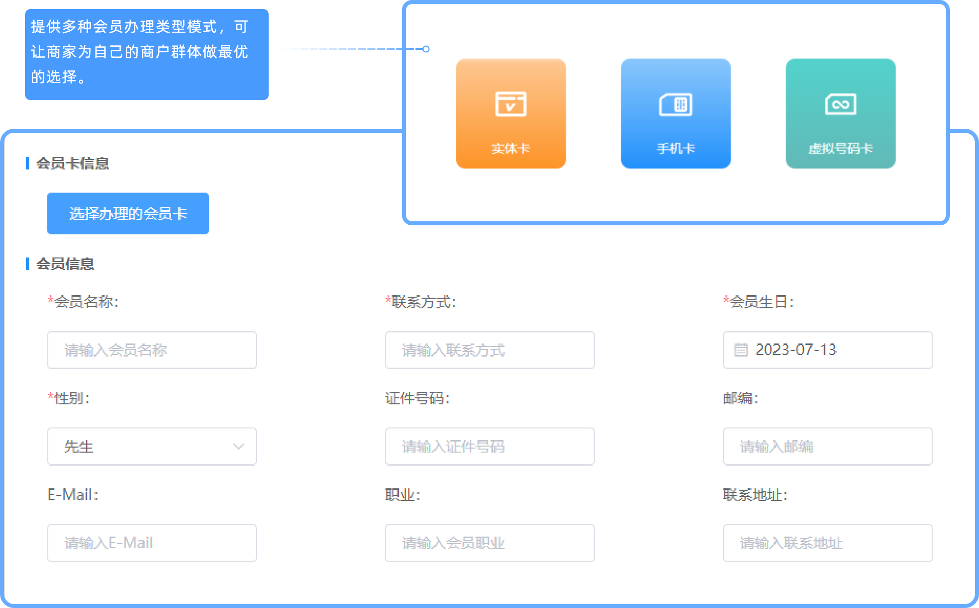 - 会员办理:我们提供三种成为会员的模式,实体卡,手机卡,虚拟号码卡。您可以结合客户群体设立会员类型,成为会员,我们还提供了一系列的会员特权和满减福利,让客户可以享受更多的便利和优惠。
